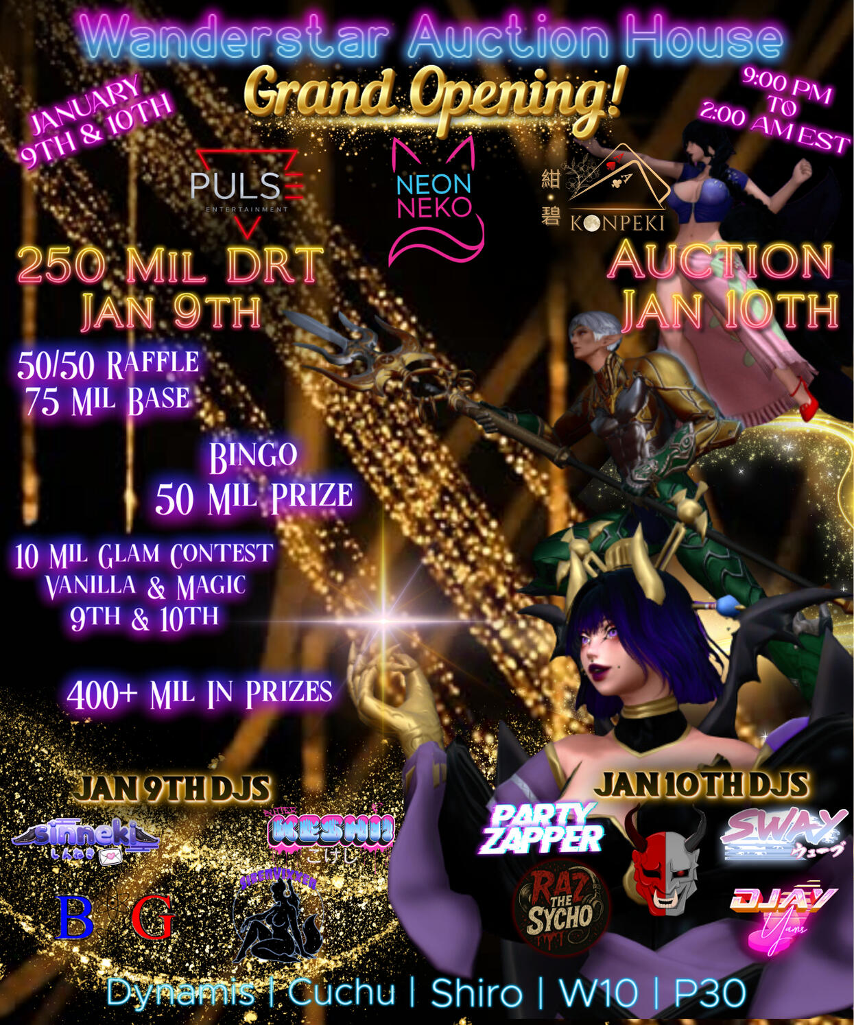 Bid Increments: 500k or More.> Starlight Cut: Based on type of Starlight. Venue Cut: Venue cut goes to prizes, raffle pots, upkeep, employee pay.> 📝 Auction Terms & Splits